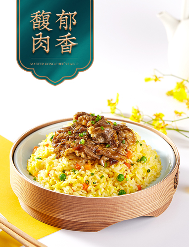 優選大米搭配雞蛋及胡蘿卜在大火翻炒下粒粒分明,色澤金黃。再加上紅蔥醬入味的上等肥牛,呈現出米香、肉香、食材香,融為一體的黃金炒飯。