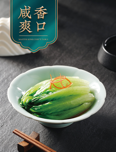 優選花葉生菜以大火燙熟,生菜色澤翠綠、口感脆嫩,最后淋上白灼汁,口味咸鮮爽口,回味無窮。